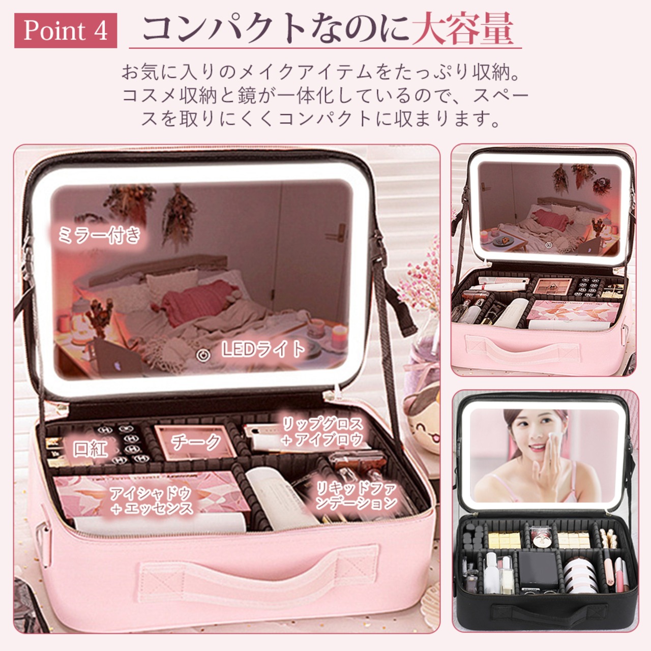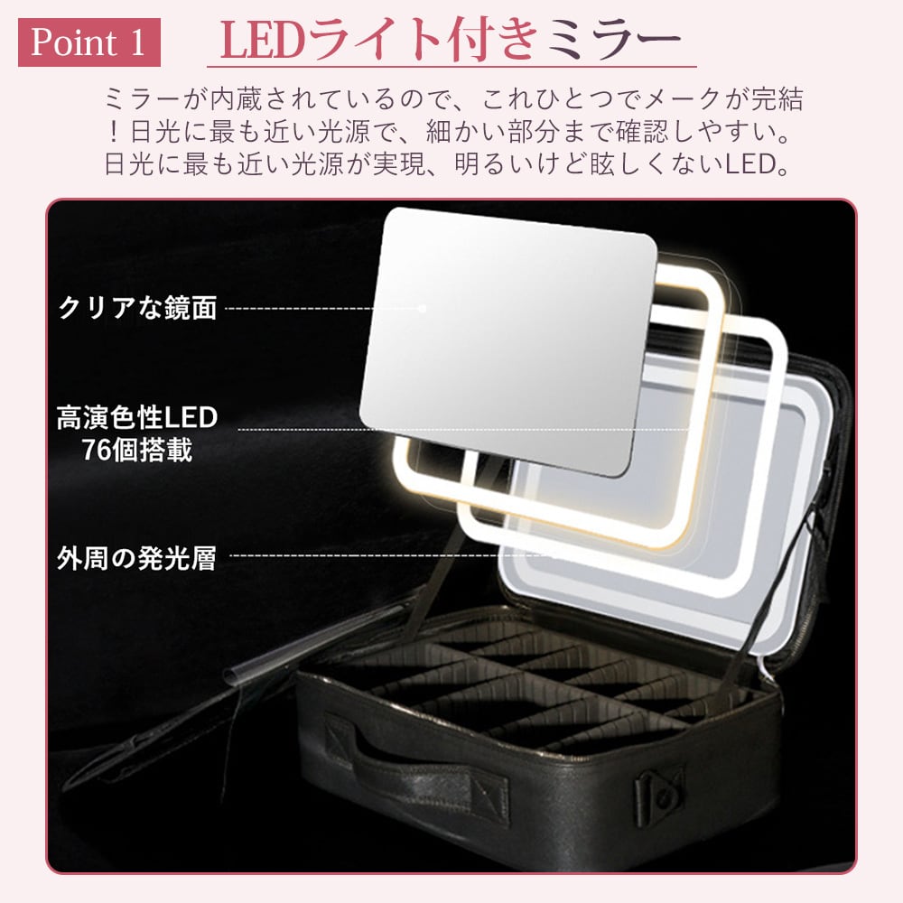 【おススメポイント】 【LEDライト付きミラー】ミラーが内蔵されているので、これひとつでメークが完結!日光に最も近い光源で、細かい部分まで確認しやすい。日光に最も近い光源が実現、明るいけど眩しくないLED。