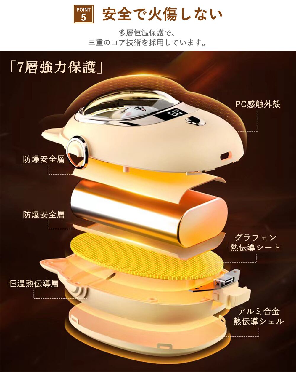 【安全素材・素肌にも優しい・多重安全保障】電気カイロには安全製のABS素材を使い、温度の上がり過ぎを防いでくれる、過充電防止、短路保護、過電圧保護、過放電保護機能があり、カイロ寿命短縮と爆発の恐れを予防します。老人と子供も安心してご利用いただけます。※高齢者は熱さに鈍感になっているケースがあり、低温火傷が心配です。低温モードお勧め。