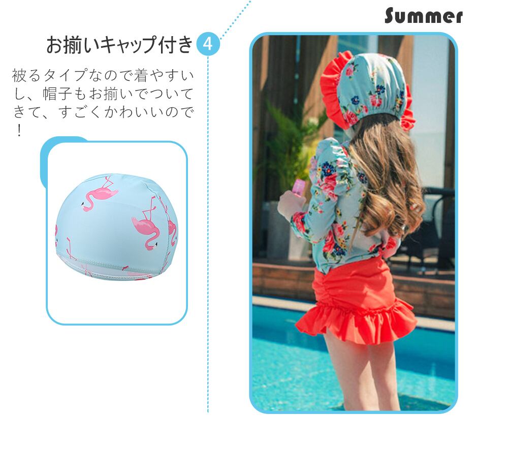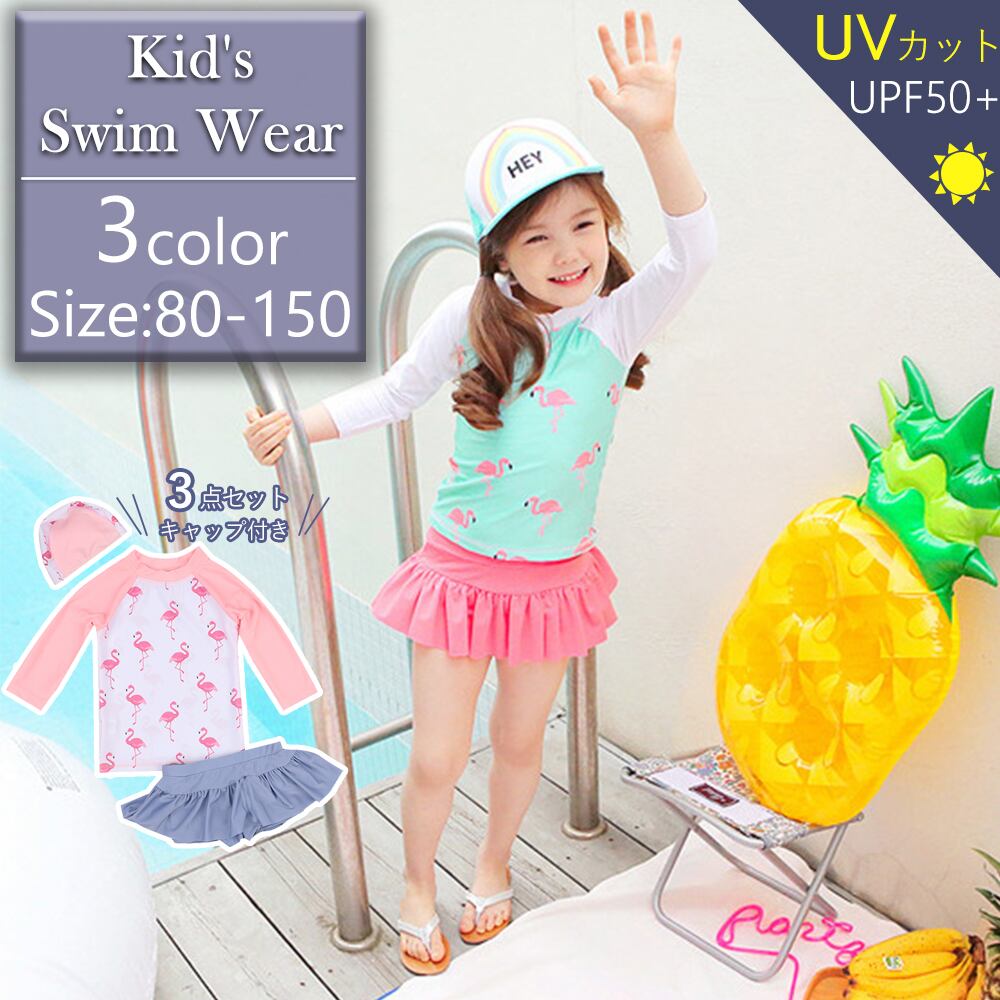 ベビー 水着 キッズ キャップつき セパレート 3点セット UV ロンパース 女の子 子供 ジュニア ベビースイミング フラミンゴ柄 フリル かわいい 80cm 90cm 100cm 110cm 120cm 130cm 140cm 150cm ラッシュガード スイムウェア