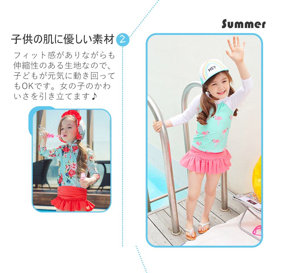 長袖タイプで日焼けを気にせず様々なシーンで水遊びを楽しめます。とてもかわいい女の子の水着です、海やプールだけでなく、スイミングスクールや幼稚園、保育園にも最適。
