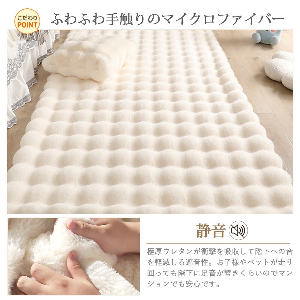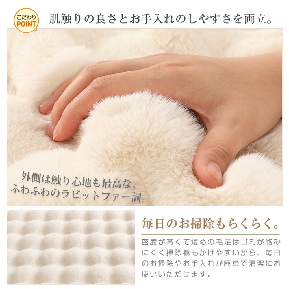 高密度ラビットファー調毛布。密度が高くて短めの毛足はゴミが絡みにくく掃除機もかけやすいから、毎日のお掃除やお手入れが簡単で清潔にお使いいただけます。