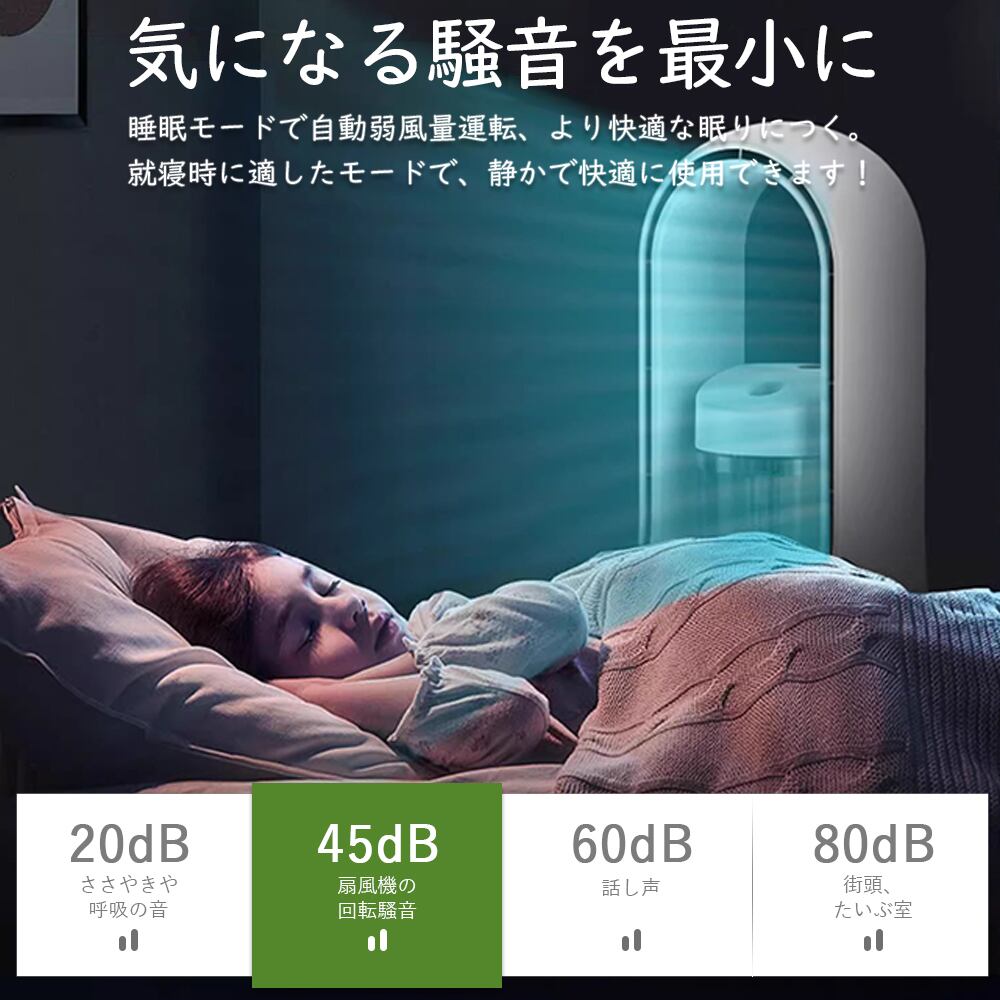 【静かな気流】このブレードレスファンの高度なボールベアリングモーターは摩擦と騒音を大幅に低減し、騒音のない気流を提供します。ノイズリダクション機能により、爽やかさを保ちながら、中断されることのない安らかな睡眠が保証されます。